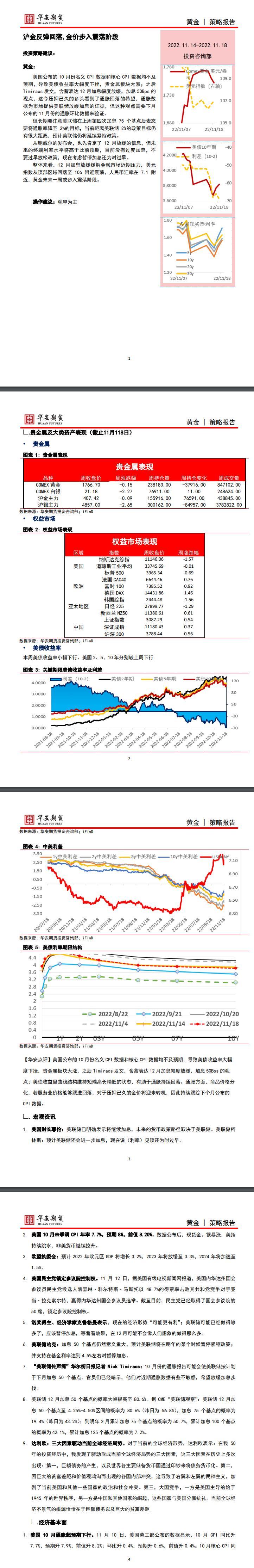 周五(11月18日)当周金价维持震荡整理的走势,多空博弈激烈。其中美联储升息的预期始终限制金价上涨,但美元见顶,全球经济衰退,地缘担忧情绪,都是金价的支撑因素。展望下周,投资者需要密切关注美联储一众官...