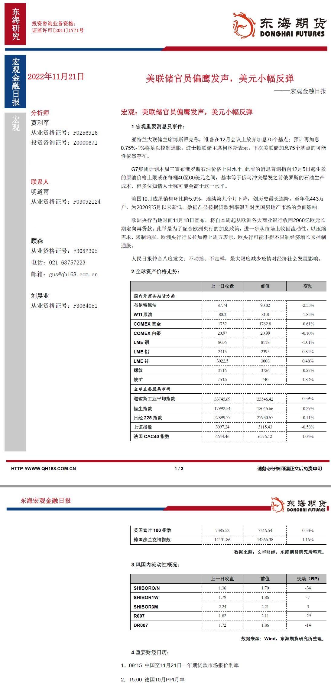 【东海期货11月21日宏观金融日报】:美联储官员偏鹰发声,美元小幅反弹