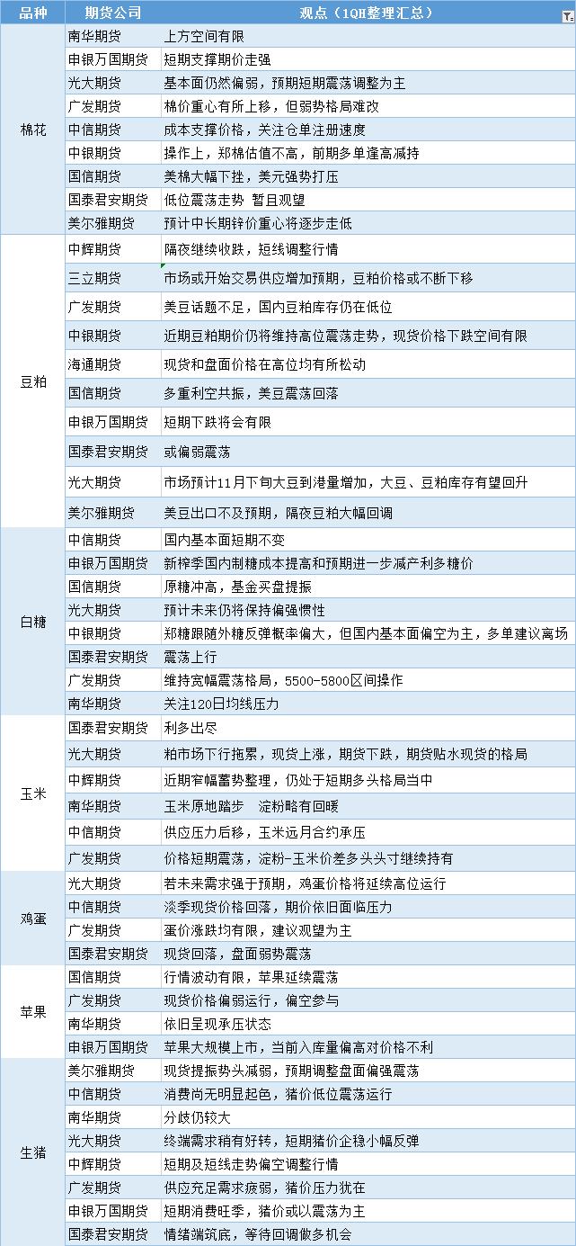 期货公司观点汇总一张图:11月15日农产品(棉花、豆粕、白糖、玉米、鸡蛋、生猪等)