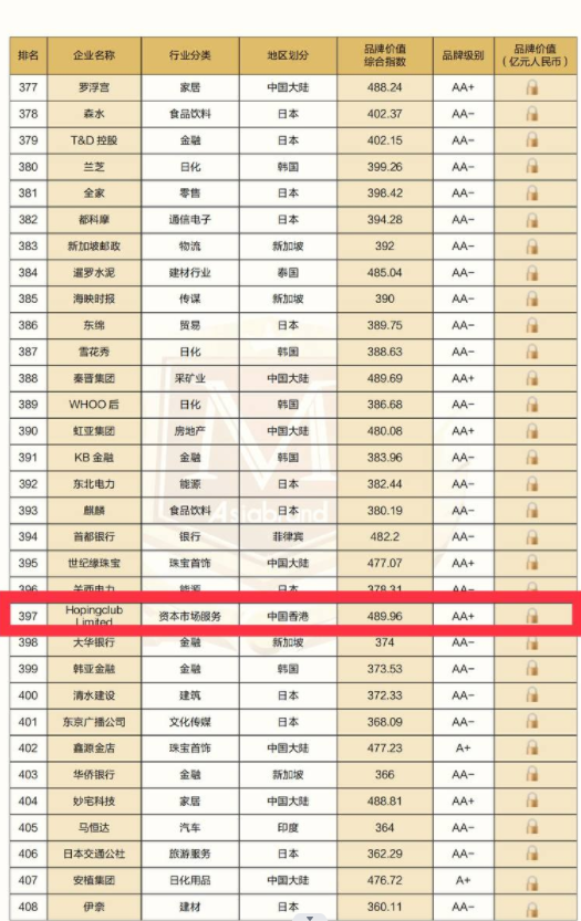 亚洲品牌500强榜单中“Hoping club华英会”赫然在列