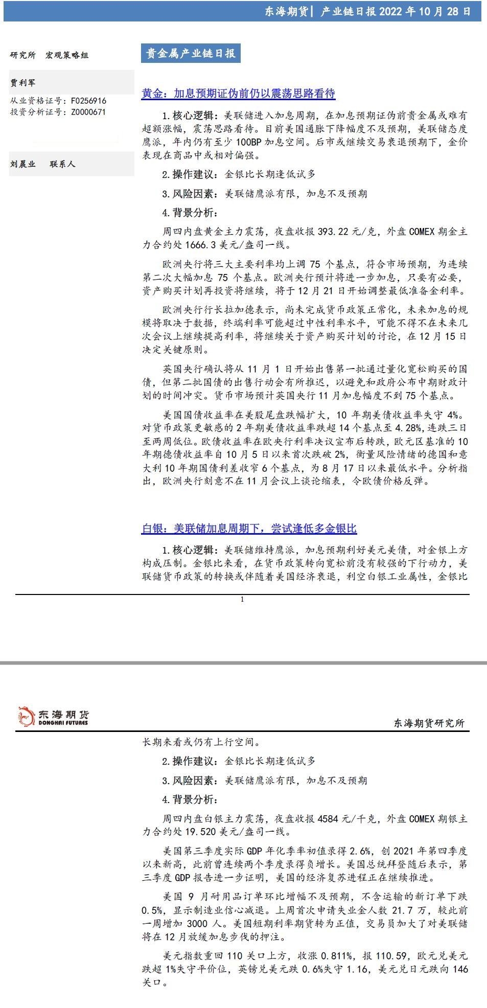 【东海期货10月28日产业链日报】贵金属篇:美国三季度实际GDP增长转正,金银震荡