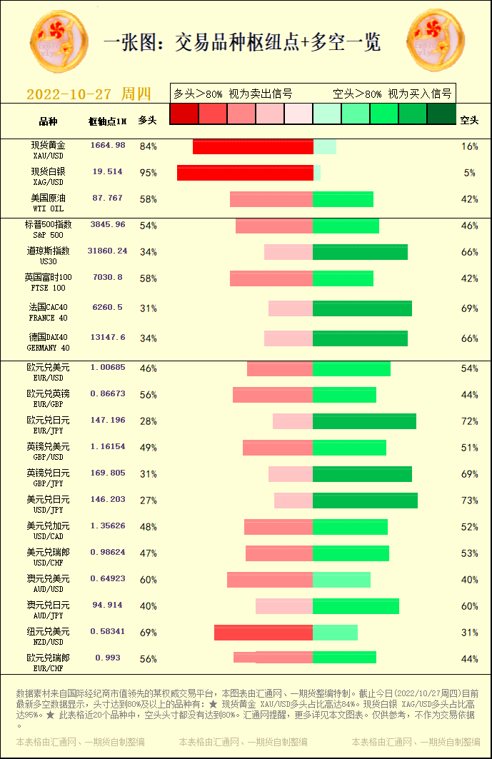 一张图:交易品种枢纽点+多空占比一览。截止今日(2022/10/27周四)目前最新多空数据显示,头寸达到80%及以上的品种有:★ 现货黄金 XAU/USD多头占比高达84%。现货白银 XAG/USD多...
