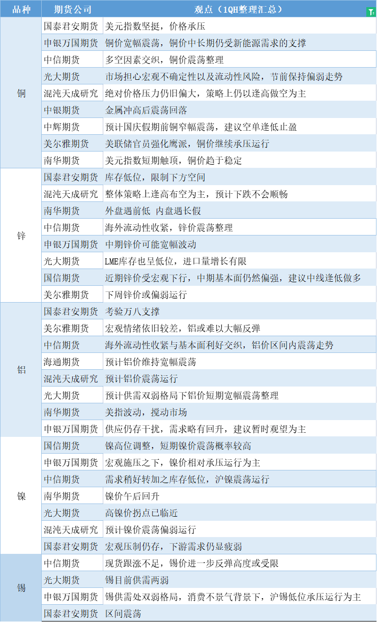 期货公司观点汇总一张图:9月28日有色系(铜、锌、铝、镍、锡等)
