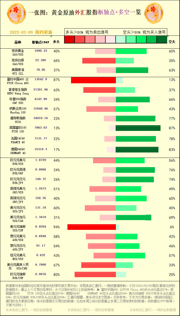 一张图:黄金原油外汇股指"枢纽点+多空占比"一览(2023/02/09周四)