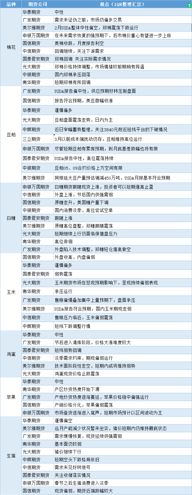 嘉盛集团APP讯——期货公司观点汇总一张图:2月9日农产品(棉花、豆粕、白糖、玉米、鸡蛋、生猪等)