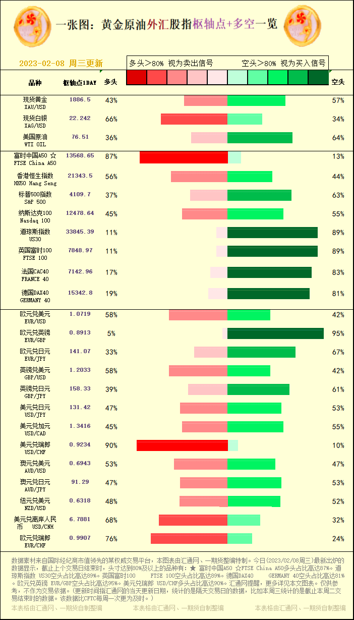 一张图:黄金原油外汇股指"枢纽点+多空占比"一览(2023/02/08周三)