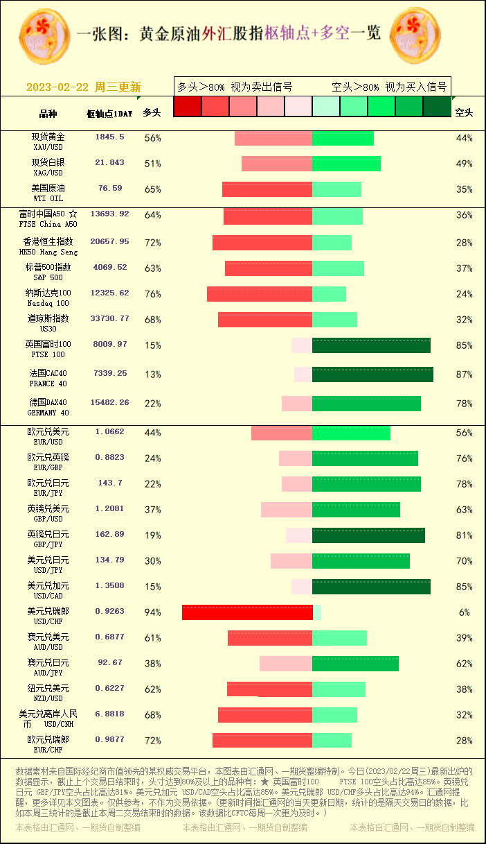 一张图:黄金原油外汇股指"枢纽点+多空占比"一览(2023/02/22周三)