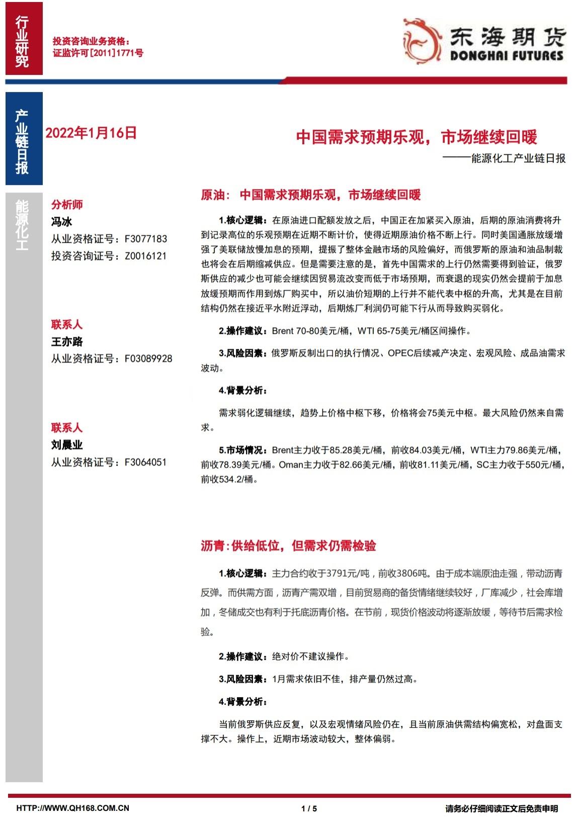 【东海期货1月16日产业链日报】能化篇:中国需求预期乐观,市场继续回暖