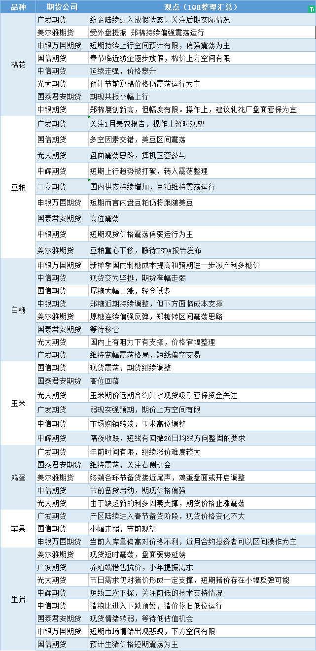 嘉盛集团APP讯——期货公司观点汇总一张图:1月11日农产品(棉花、豆粕、白糖、玉米、鸡蛋、生猪等)