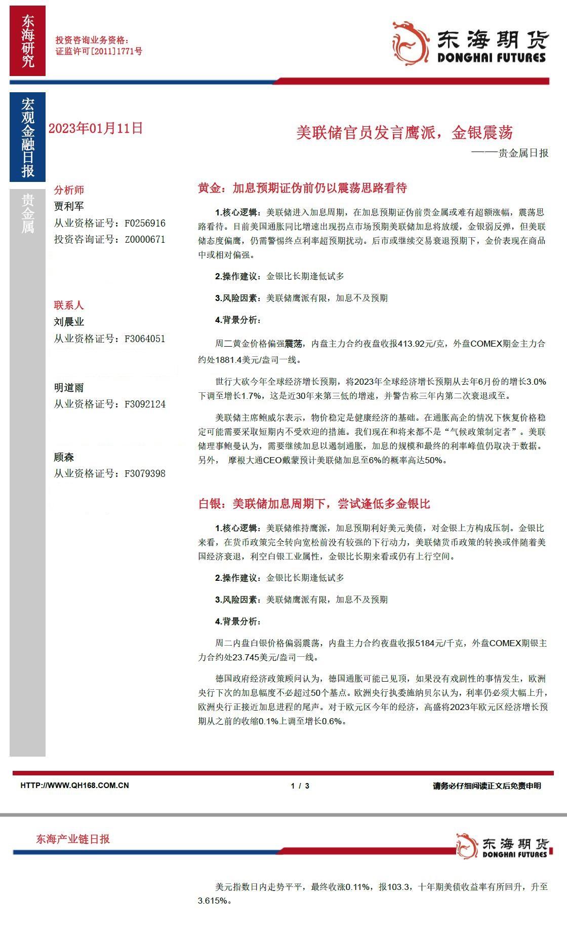 【东海期货1月11日产业链日报】贵金属篇:美联储官员发言鹰派,金银震荡