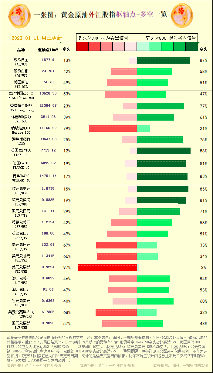 一张图:黄金原油外汇股指"枢纽点+多空占比"一览(2023/01/11周三)