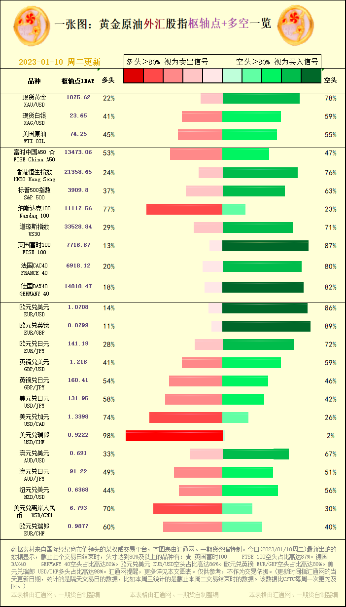 一张图:黄金原油外汇股指"枢纽点+多空占比"一览(2023/01/10周二)