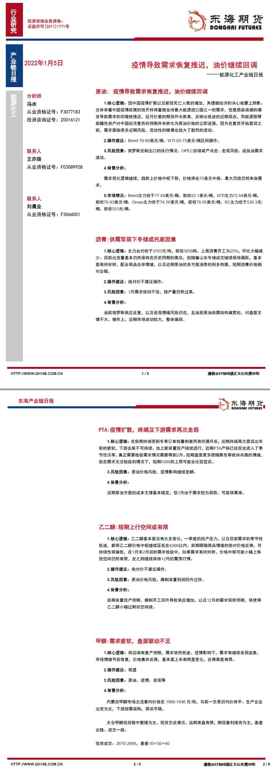 【东海期货1月5日产业链日报】能化篇:疫情导致需求恢复推迟,油价继续回调