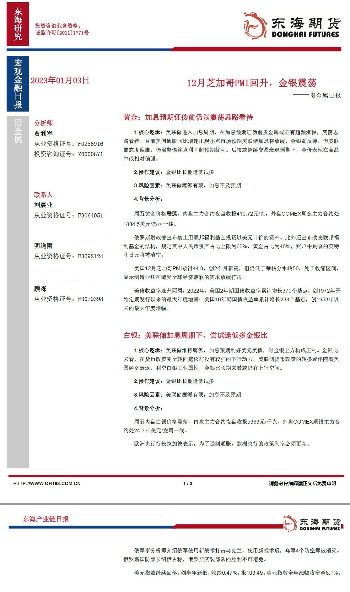 【东海期货1月3日产业链日报】贵金属篇:12月芝加哥PMI回升,金银震荡