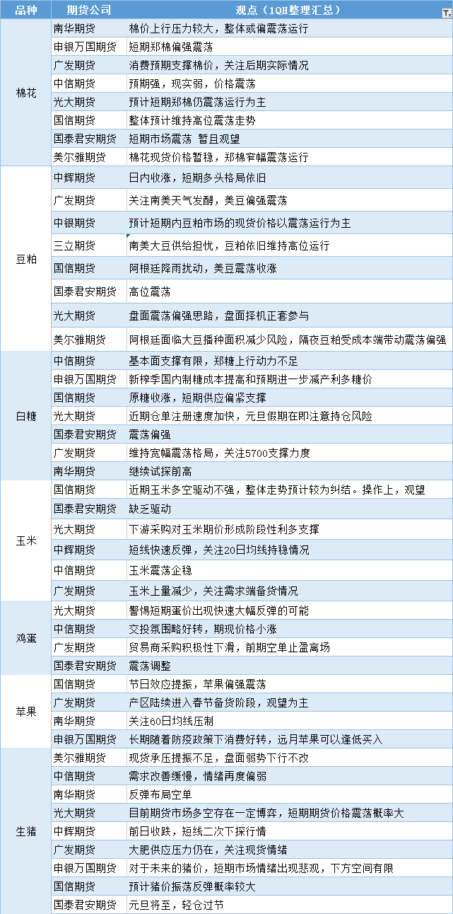 嘉盛集团APP讯——期货公司观点汇总一张图:12月30日农产品(棉花、豆粕、白糖、玉米、鸡蛋、生猪等)