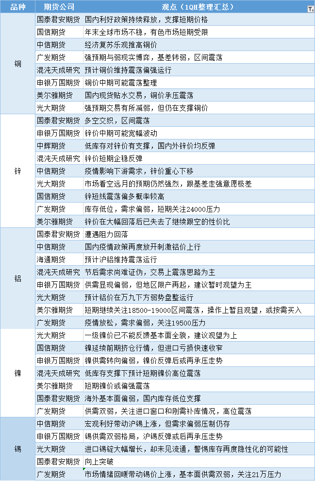 期货公司观点汇总一张图:12月29日有色系(铜、锌、铝、镍、锡等)