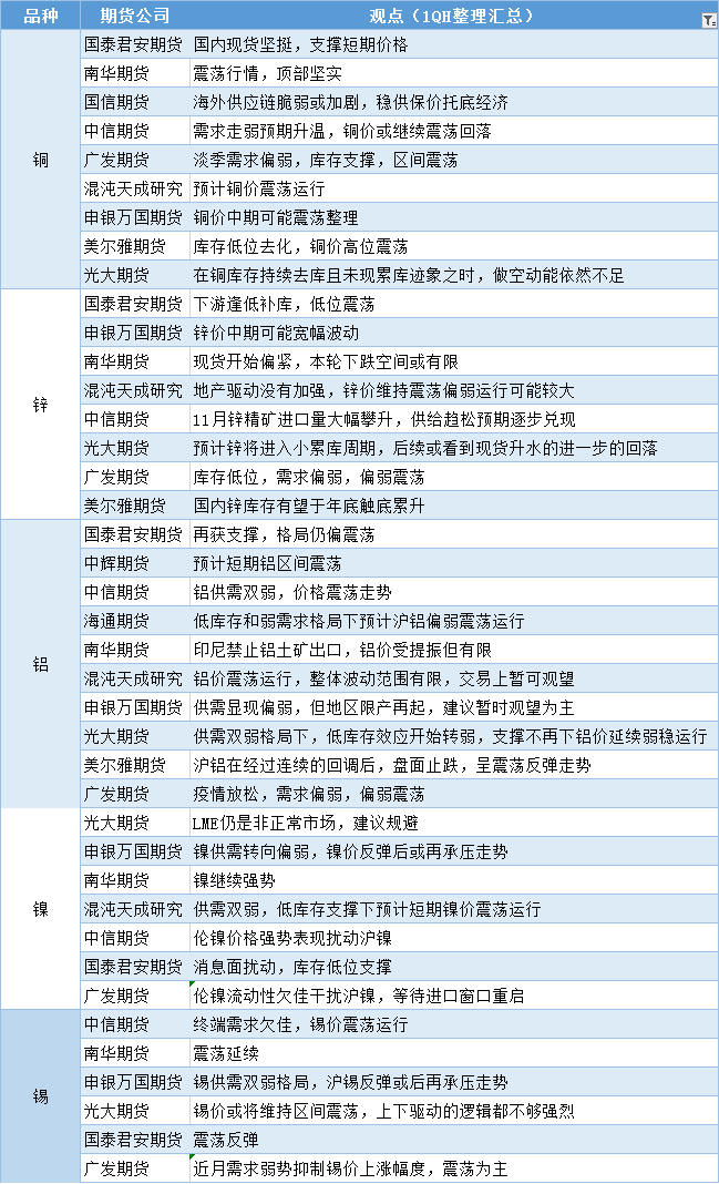期货公司观点汇总一张图:12月22日有色系(铜、锌、铝、镍、锡等)