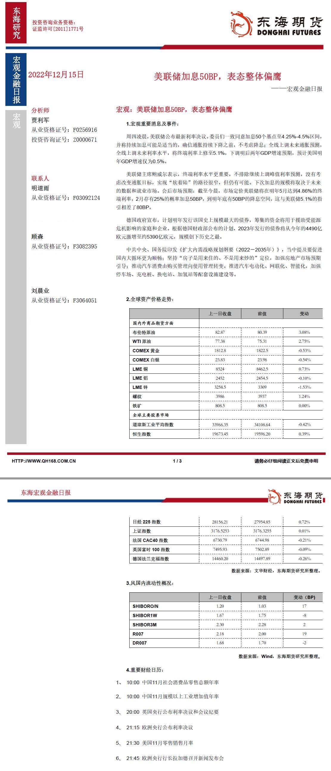【东海期货12月15日宏观金融日报】美联储加息50BP,表态整体偏鹰