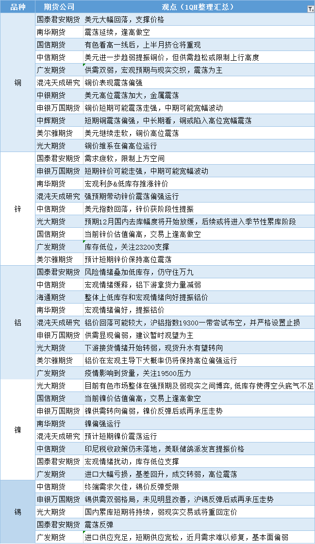 期货公司观点汇总一张图:12月2日有色系(铜、锌、铝、镍、锡等)