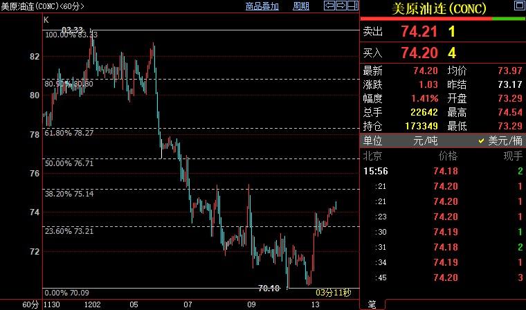 北京时间15:57,NYMEX原油期货上涨1.45%至74.23美元/桶;ICE布伦特原油期货上涨1.60%至79.24美元/桶。
