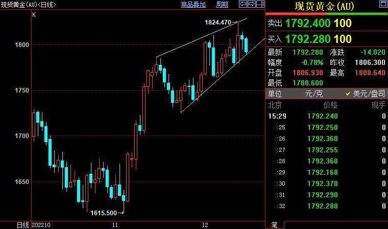 北京时间15:31,现货黄金下跌0.82%至1792.89美元/盎司;COMEX期金主力合约下跌0.89%至1802.7美元/盎司;美元指数上浮0.26%至103.89。