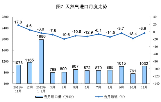 1—11月份,生产天然气1974亿立方米,同比增长6.4%。进口天然气9901万吨,同比下降9.7%。