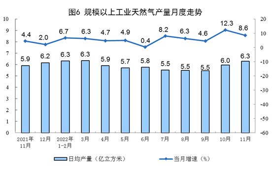 天然气生产增速回落,进口降幅明显收窄。11月份生产天然气189亿立方米,同比增长8.6%,增速比上月回落3.7个百分点,日均产量6.3亿立方米。进口天然气1032万吨,同比下降3.9%,降幅比上月收窄14.5个百分点。