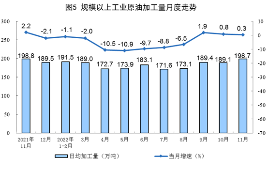 原油加工增速略有放缓。11月份,加工原油5961万吨,同比增长0.3%,增速比上月放缓0.5个百分点,日均加工198.7万吨。1—11月份,加工原油61599万吨,同比下降3.9%。