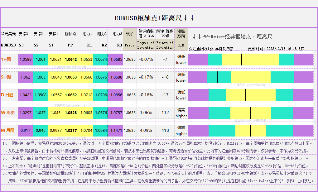 嘉盛集团APP讯——图解价格偏离度:14个热门货币对枢轴点+距离尺一览。截至今日(2022/12/16周五)目前最新数据显示,14个热门货币对中:交易品种★EURUSD欧元美元,综评偏离度 3.36%,综评:偏高122点。★USDJPY美元日元,综评偏离度-2.14%,综评:偏低89点。★GBPUSD英镑美元,综评偏离度2.38%,综评:偏高46点。★AUDUSD澳元美元,综评偏离度0.54%,综评:偏低27点。综评偏离度及综评偏离点数的含义,详见本文图表解释。