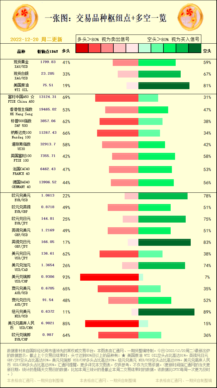 更新: 20 12月 嘉盛集团APP讯——一张图:交易品种枢纽点+多空占比一览。今日(2022/12/20周二)最新出炉的数据显示,截止上个交易日结束时,头寸达到80%及以上的品种有:★ 美国原油 WTI OIL空头占比高达81%。英镑兑日元 GBP/JPY空头占比高达83%。美元兑瑞郎 USD/CHF多头占比高达93%。纽元兑美元 NZD/USD空头占比高达89%。美元兑离岸人民币 USD/CNH多头占比高达85%。汇通网提醒,更多详见本文图表。仅供参考,不作为交易依据。【本图表涉及到的交易品种有:现货黄金、现货白银、美国原油、富时中国A50、香港恒生指数、标普500指数、纳斯达克指数、道琼斯指数、英国富时100、法国CAC40、德国DAX40、欧元兑美元、欧元兑英镑、欧元兑日元、英镑兑美元、英镑兑日元、美元兑日元、美元兑加元、美元兑瑞郎、澳元兑美元、澳元兑日元、纽元兑美元、美元兑离岸人民币、欧元兑瑞郎。】(更新时间指汇通网的当天更新日期,统计的是隔天交易日的数据,比如本周三统计的是截止本周二交易结束时的数据。该数据比CFTC每周一次更为及时。) 标题:一张图:交易品种枢纽点+多空占比一览(2022/12/20周二) 地址:https://www.jiasmai.com/article/1149.html ← 黄金市场分析:只有彻底穿透1800美元关口,或才可开启一段明显的上升之途 → 对冲基金终于开始看好黄金和白银,已在增加多头头寸!