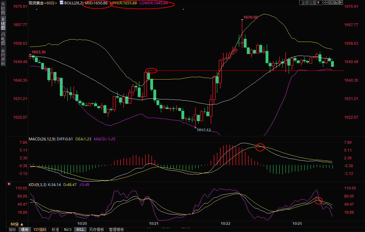 1小时级别:布林线收口后接近水平运行,留意布林线轨道1645.90-1655.85区域突破情况。目前MACD死叉,KDJ死叉,顶破布林线中轨1650.86前,震荡下破的风险要略高一点。