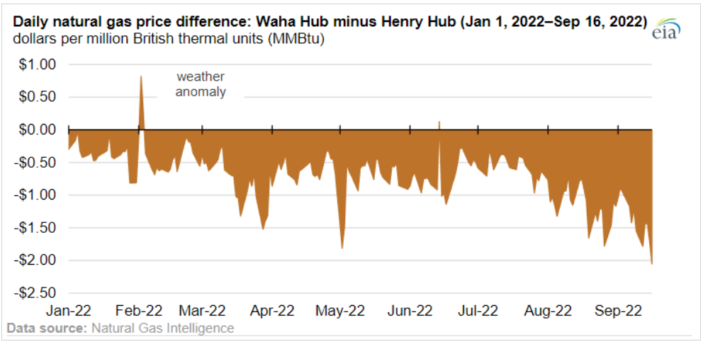 自2021年底以来,西德克萨斯州瓦哈中心和作为美国基准的路易斯安那州亨利港(Henry Hub)的天然气价格之间的价差就一直在扩大。