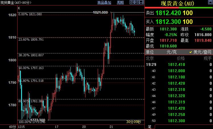 北京时间19:30,现货黄金下跌0.33%至1812.96美元/盎司;COMEX期金主力合约下跌0.21%至1821.5美元/盎司;美元指数上浮0.15%至104.140。