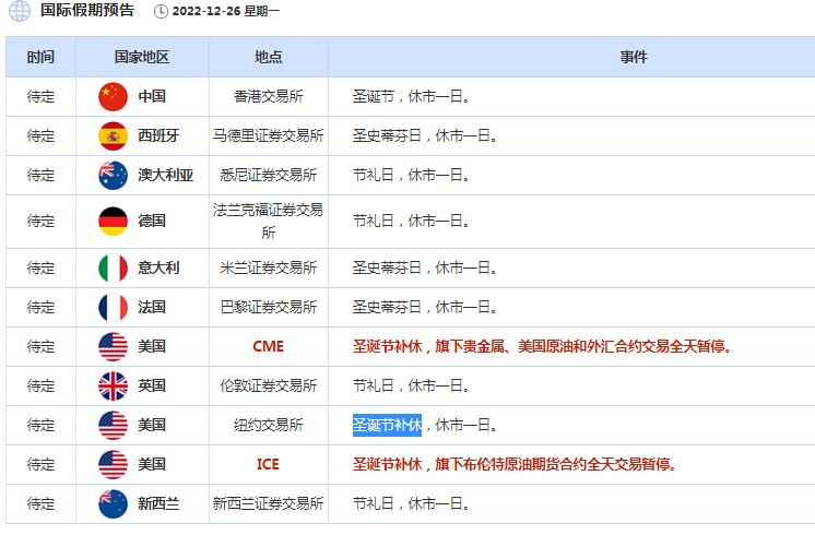 周一为圣诞节补休,欧美金融市场普遍休市,预计汇市交投也非常清淡。