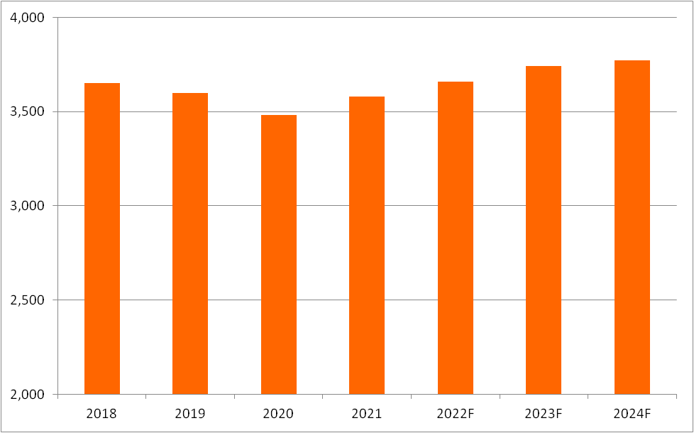 加拿大和美国的产量预计将在2022年分别增长19%和9.8%,达到225吨和201吨。由于自2020年4月以来一直处于维护和保养的Porgera金矿重新启动,预计到2022年,巴布亚新几内亚的产量将增加31%,达到55吨。
