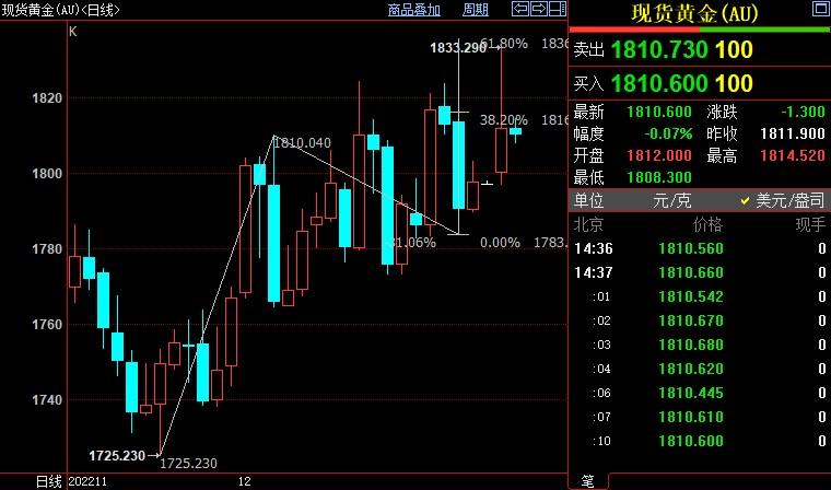 北京时间14:38,现货黄金下跌0.15%至1810.90美元/盎司;COMEX期金主力合约下跌0.27%至1818.1美元/盎司;美元指数下沉0.01%至104.197。
