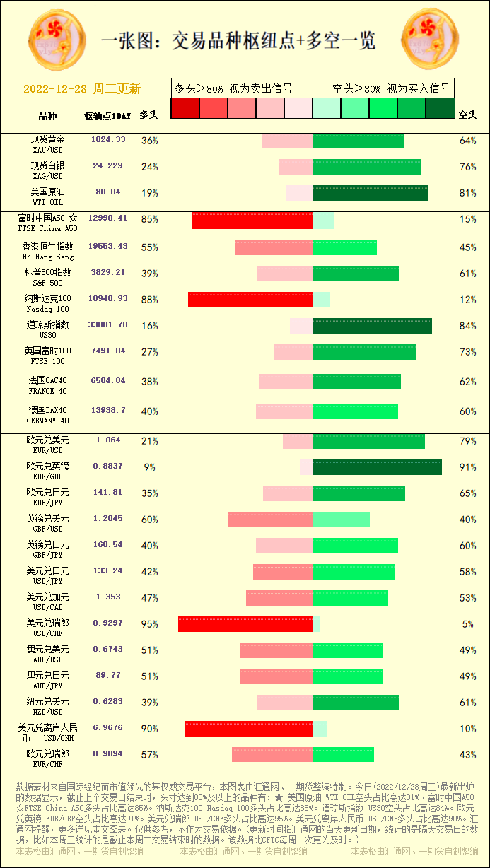 嘉盛集团APP讯——一张图:交易品种枢纽点+多空占比一览。今日(2022/12/28周三)最新出炉的数据显示,截止上个交易日结束时,头寸达到80%及以上的品种有:★ 美国原油 WTI OIL空头占比高达81%。富时中国A50 ☆FTSE China A50多头占比高达85%。纳斯达克100 Nasdaq 100多头占比高达88%。道琼斯指数 US30空头占比高达84%。欧元兑英镑 EUR/GBP空头占比高达91%。