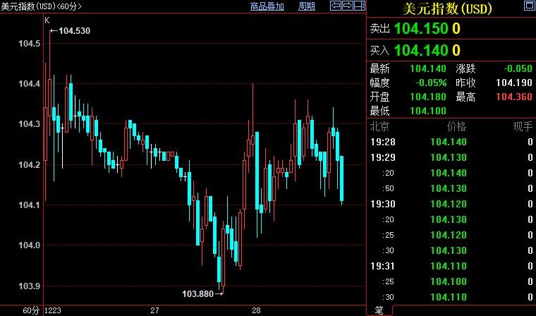 北京时间19:42,现货黄金下跌0.61%至1802.50美元/盎司;COMEX期金主力合约下跌0.73%至1809.8美元/盎司;美元指数下跌0.04%至104.155。