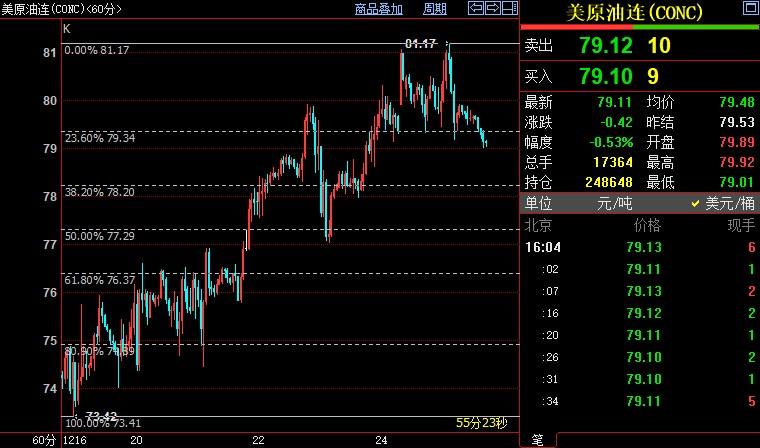 北京时间16:05,NYMEX原油期货下跌0.52%至79.12美元/桶;ICE布伦特原油期货下跌0.39%至84.35美元/桶。