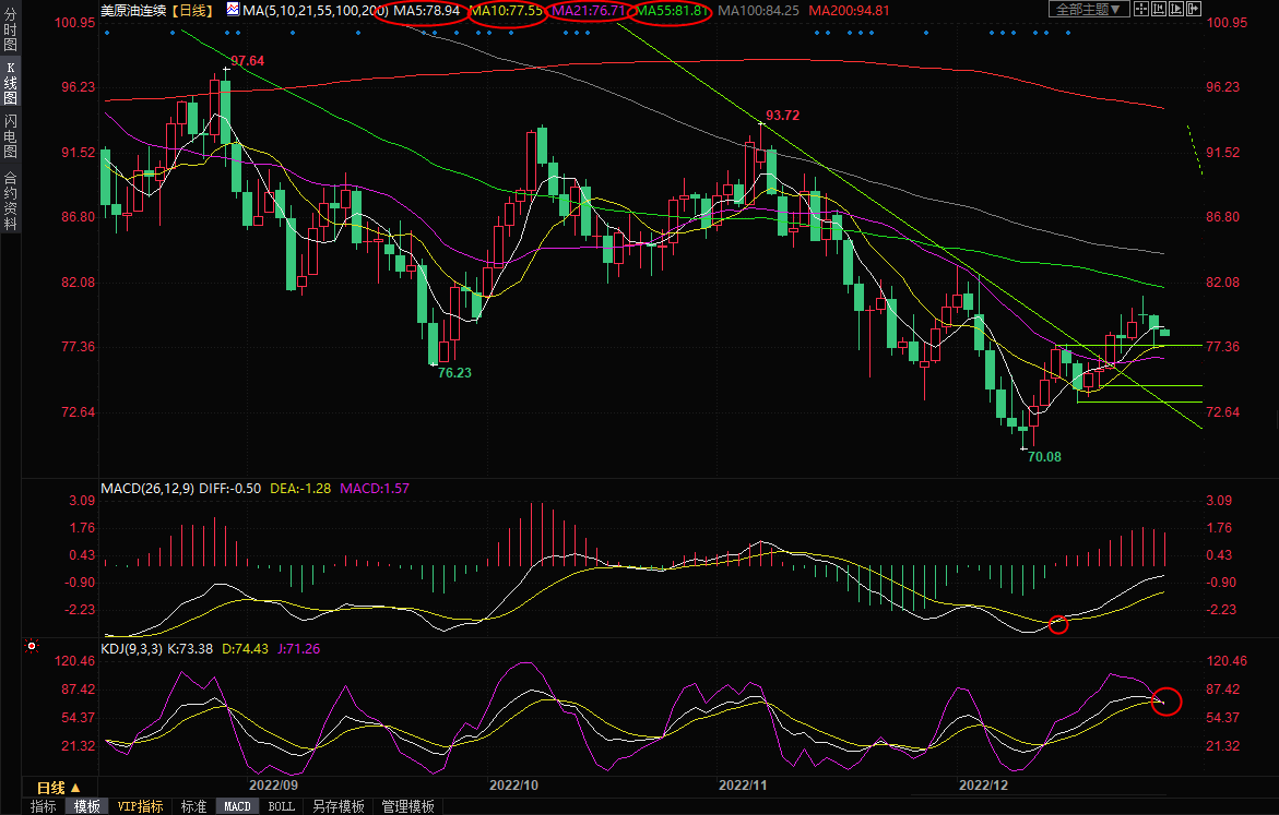若油价能够坚守21日均线76.70附近支撑,则后市多头仍有进一步反弹机会;目前5日均线阻力在78.93附近,然后是80整数关口附近阻力,55日均线阻力在81.81附近,若能顶破该阻力,则增加短线看涨信号。