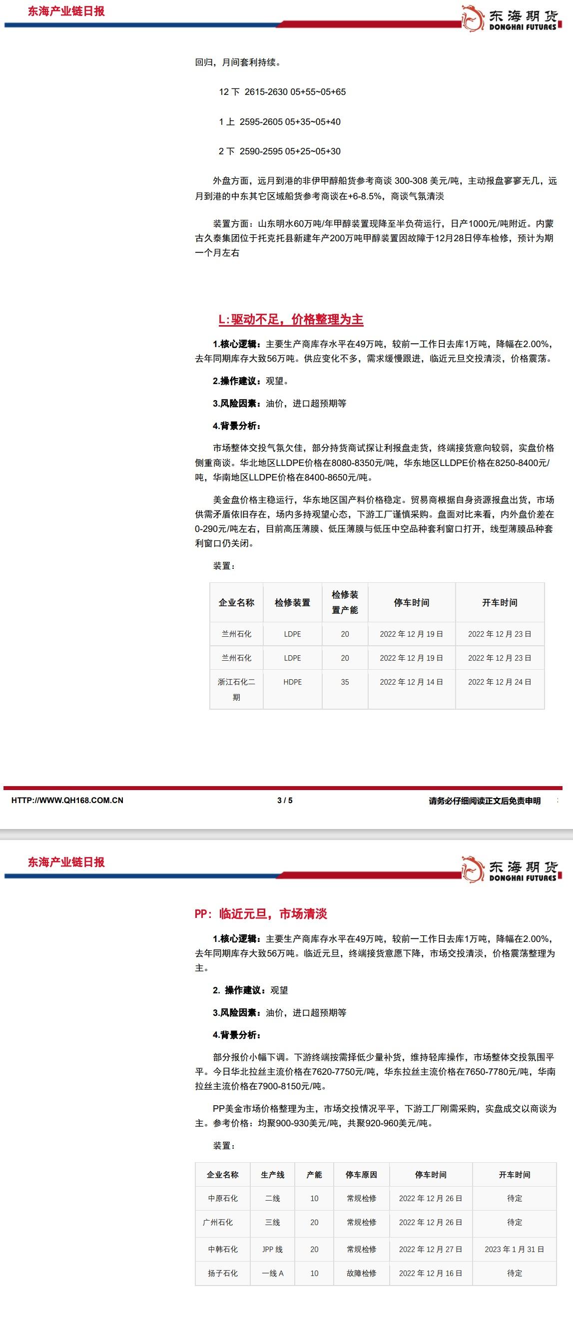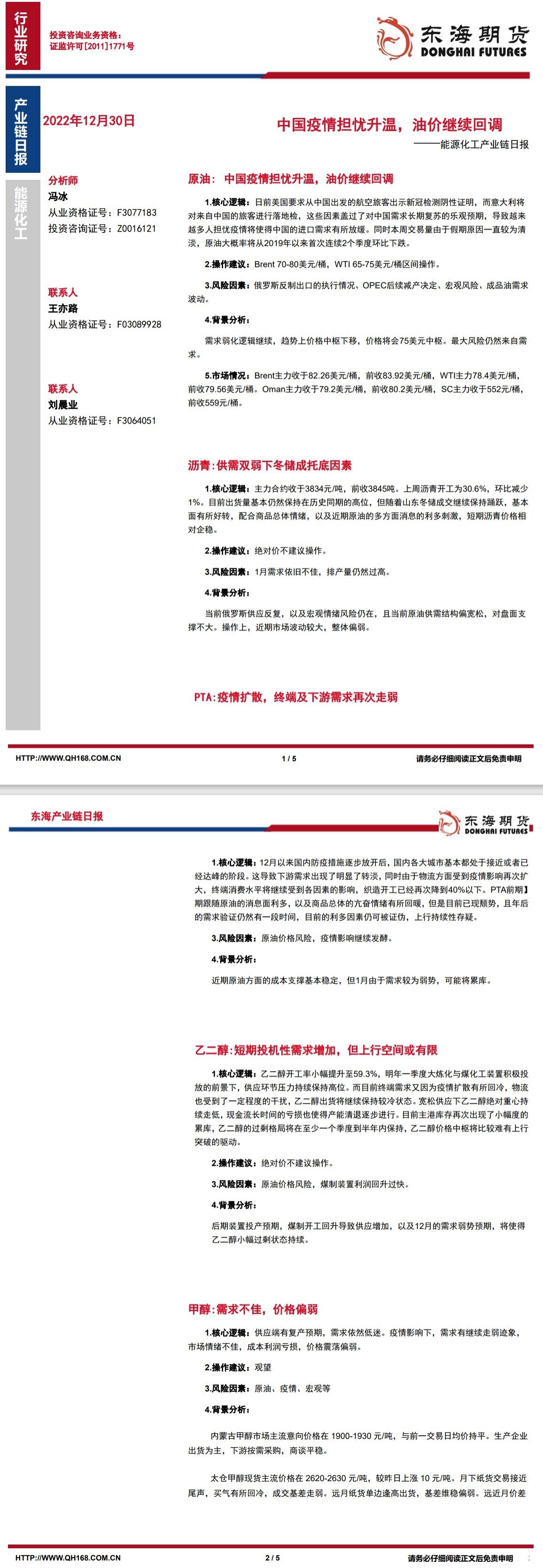 更新: 30 12月 嘉盛集团APP讯——原油: 中国疫情担忧升温,油价继续回调。沥青:供需双弱下冬储成托底因素。PTA:疫情扩散,终端及下游需求再次走弱。乙二醇:短期投机性需求增加,但上行空间或有限。甲醇:需求不佳,价格偏弱。L:驱动不足,价格整理为主。PP: 临近元旦,市场清淡。东海期货公司授权文本由“专注期货开户交易及专业行情分析资讯网站”:【一期货 www.1qh.cn】转发 标题:【东海期货12月30日产业链日报】能化篇:中国疫情担忧升温,油价继续回调 地址:https://www.jiasmai.com/article/1356.html ← 【东海期货12月30日宏观金融日报】:财政部表示2023年要适度扩大财政支出规模 → 【东海期货12月30日产业链日报】贵金属篇:美元美债收益率偏弱,金银偏强运行