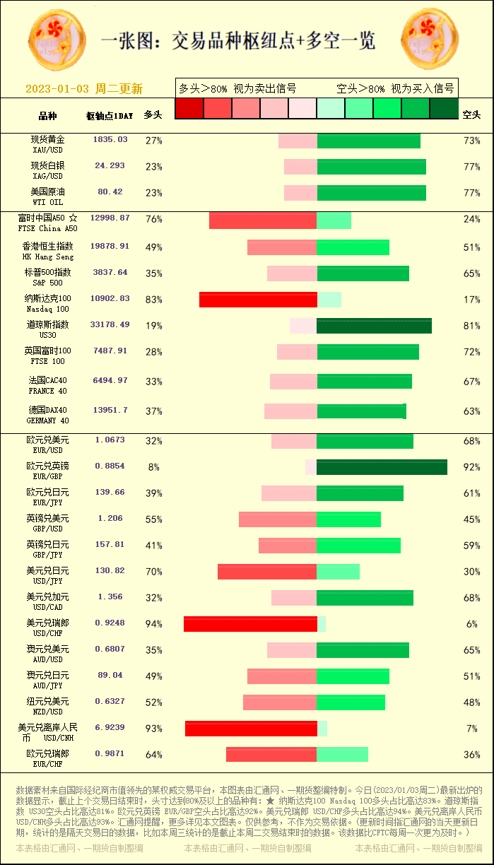 更新: 03 01月 嘉盛集团APP讯——一张图:交易品种枢纽点+多空占比一览。今日(2023/01/03周二)最新出炉的数据显示,截止上个交易日结束时,头寸达到80%及以上的品种有:★ 纳斯达克100 Nasdaq 100多头占比高达83%。道琼斯指数 US30空头占比高达81%。欧元兑英镑 EUR/GBP空头占比高达92%。美元兑瑞郎 USD/CHF多头占比高达94%。美元兑离岸人民币 USD/CNH多头占比高达93%。汇通网提醒,更多详见本文图表。仅供参考,不作为交易依据。【本图表涉及到的交易品种有:现货黄金、现货白银、美国原油、富时中国A50、香港恒生指数、标普500指数、纳斯达克指数、道琼斯指数、英国富时100、法国CAC40、德国DAX40、欧元兑美元、欧元兑英镑、欧元兑日元、英镑兑美元、英镑兑日元、美元兑日元、美元兑加元、美元兑瑞郎、澳元兑美元、澳元兑日元、纽元兑美元、美元兑离岸人民币、欧元兑瑞郎。】(更新时间指汇通网的当天更新日期,统计的是隔天交易日的数据,比如本周三统计的是截止本周二交易结束时的数据。该数据比CFTC每周一次更为及时。) 标题:一张图:交易品种枢纽点+多空占比一览(2023/01/03周二) 地址:https://www.jiasmai.com/article/1381.html ← 2023年七大货币走势前瞻:美元或扩大跌幅,地缘政治影响欧元和英镑命运! → 欧盟禁令生效在即 俄罗斯赶在制裁前大量出口柴油
