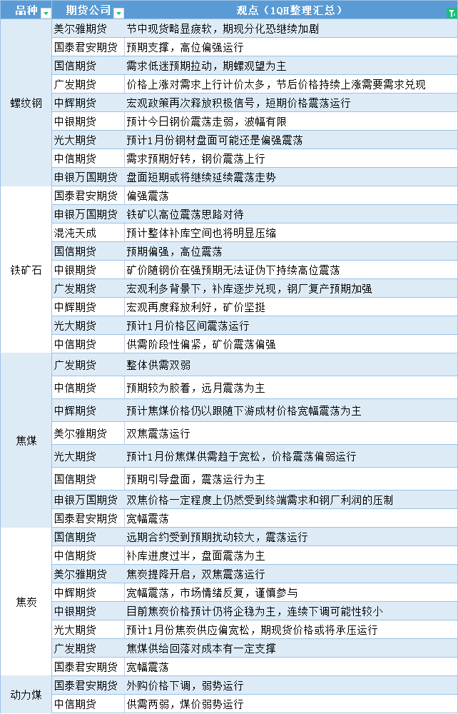 更新: 03 01月 嘉盛集团APP讯——期货公司观点汇总一张图:1月3日黑色系(螺纹钢、焦煤、焦炭、铁矿石、动力煤等) 标题:期货公司观点汇总一张图:1月3日黑色系(螺纹钢、焦煤、焦炭、铁矿石、动力煤等) 地址:https://www.jiasmai.com/article/1388.html ← 期货公司观点汇总一张图:1月3日有色系(铜、锌、铝、镍、锡等) → 【东海期货1月3日产业链日报】贵金属篇:12月芝加哥PMI回升,金银震荡