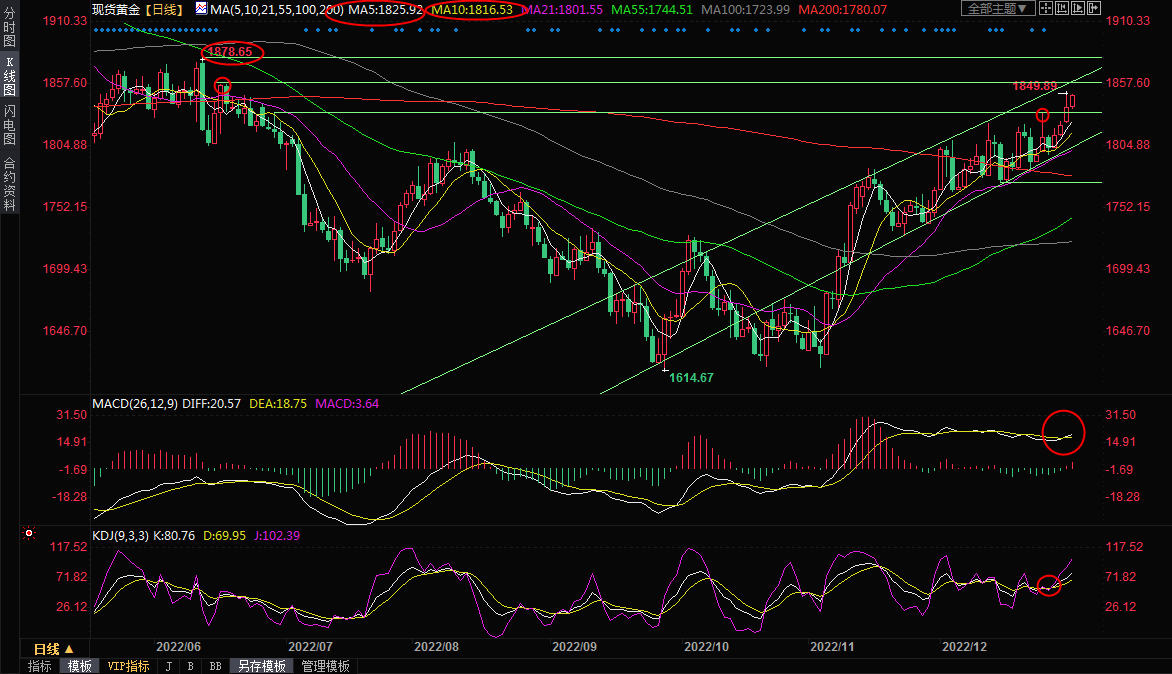 日线级别:震荡上涨;MACD重新结成金叉,KDJ金叉,短期均线多头排列,短线多头明显占据上风,有望进一步试探6月16日高点1857.39附近阻力,短线上涨通道的上轨阻力也在该位置附近,如果顶破该阻力,则金价可能会加速上涨,进一步阻力参考1870关口,关键阻力参考6月13日高点1878.65附近阻力。