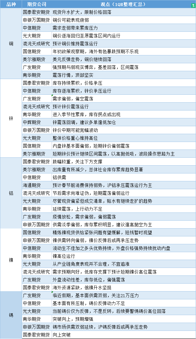 更新: 04 01月 嘉盛集团APP讯——期货公司观点汇总一张图:1月4日有色系(铜、锌、铝、镍、锡等) 标题:期货公司观点汇总一张图:1月4日有色系(铜、锌、铝、镍、锡等) 地址:https://www.jiasmai.com/article/1417.html ← 期货公司观点汇总一张图:1月4日农产品(棉花、豆粕、白糖、玉米、鸡蛋、生猪等) → 期货公司观点汇总一张图:1月4日黑色系(螺纹钢、焦煤、焦炭、铁矿石、动力煤等)