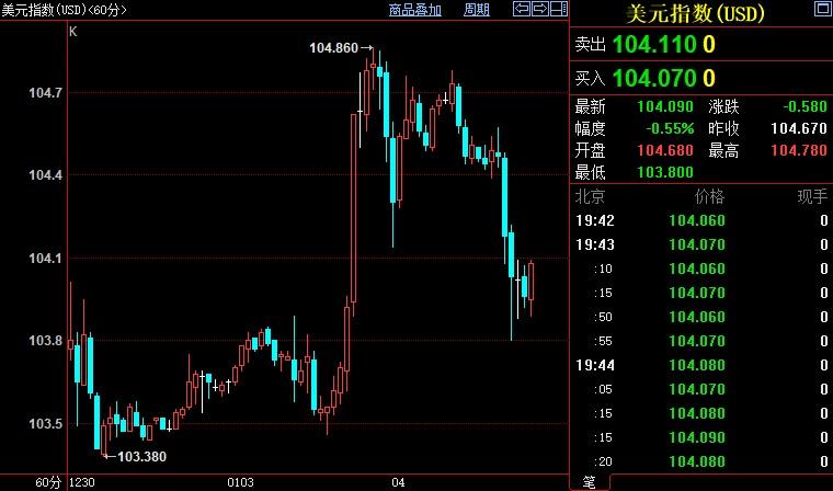 北京时间19:44,现货黄金上涨1.05%至1858.22美元/盎司;COMEX期金主力合约上涨0.98%至1864.2美元/盎司;美元指数下跌0.57%至104.091。