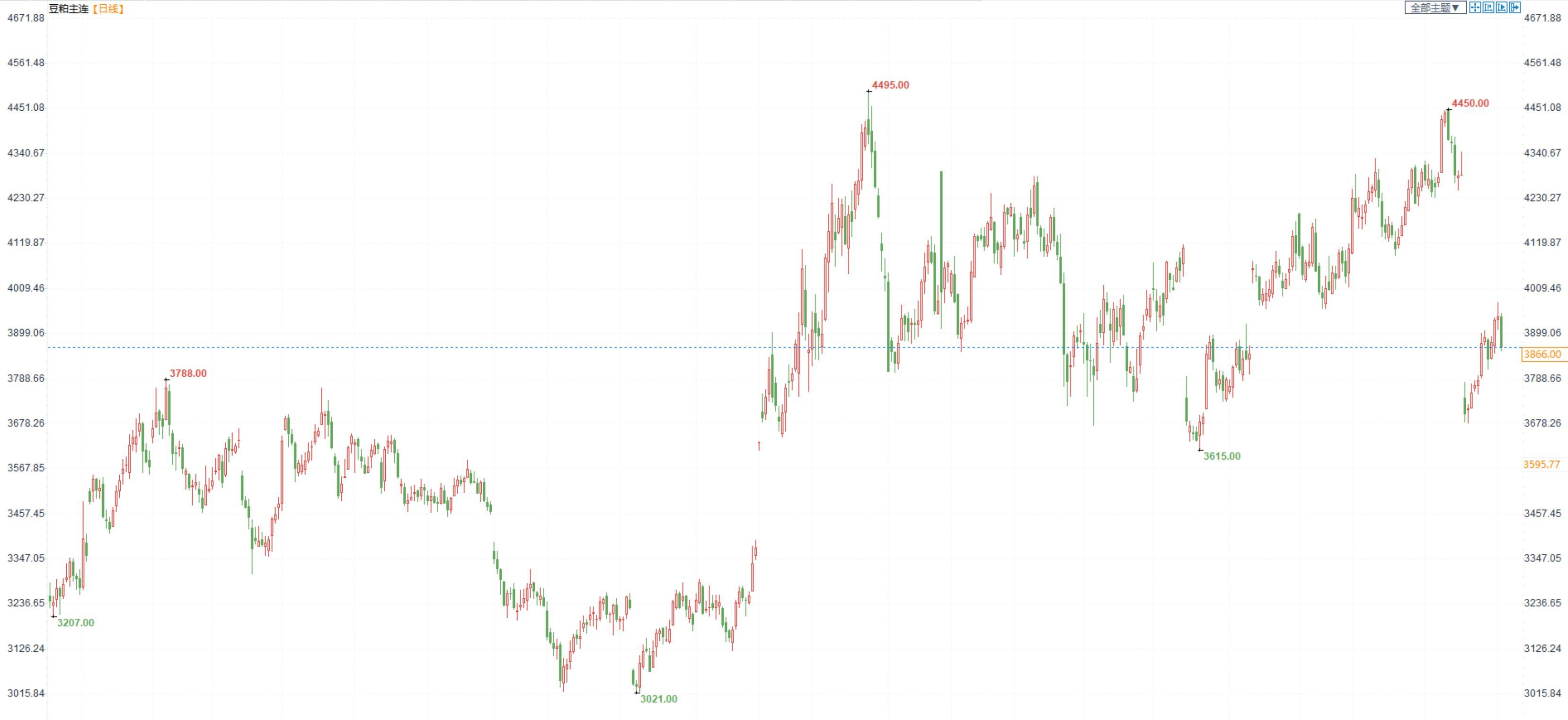 豆粕2305合约日内跌1.93%,收盘价3866元/吨,现货张家港43%蛋白豆粕4615元/吨