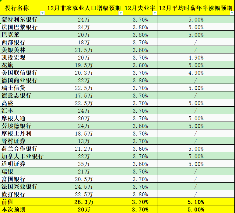 更新: 05 01月 嘉盛集团APP讯——北京时间周五(1月6日)21:30,美国将公布12月季调后非农就业人口变动和失业率。周四(1月5日),包括摩根士丹利在内的24家大型投行发表了对此次数据的前瞻,具体如下。24家大型投行预测显示,主要投行认为12月非农增速进一步下滑,但投行之间的增幅预期差距较大。具体而言,投行预测美国12月季调后非农就业人口增幅料介于13万-35万(前值26.3万),失业率料介于3.6%-3.8%(前值3.7%),平均时薪年率增幅料介于4.9%-5.0%(前值5.1%)。和前值相比,投行认为12月非农增速进一步放缓,相比之下失业率和平均时薪年率和前值相差不大。若数据显示12月非农增幅真如投行预测那样继续放缓,黄金有望获得支撑。 标题:24家投行前瞻12月非农:增速料进一步放缓,黄金有望获得提振 地址:https://www.jiasmai.com/article/1432.html ← 美原油交易策略:多重利空压制,油价或延续跌势 → 国际金价遇阻1860美元,市场焦点转向就业领域