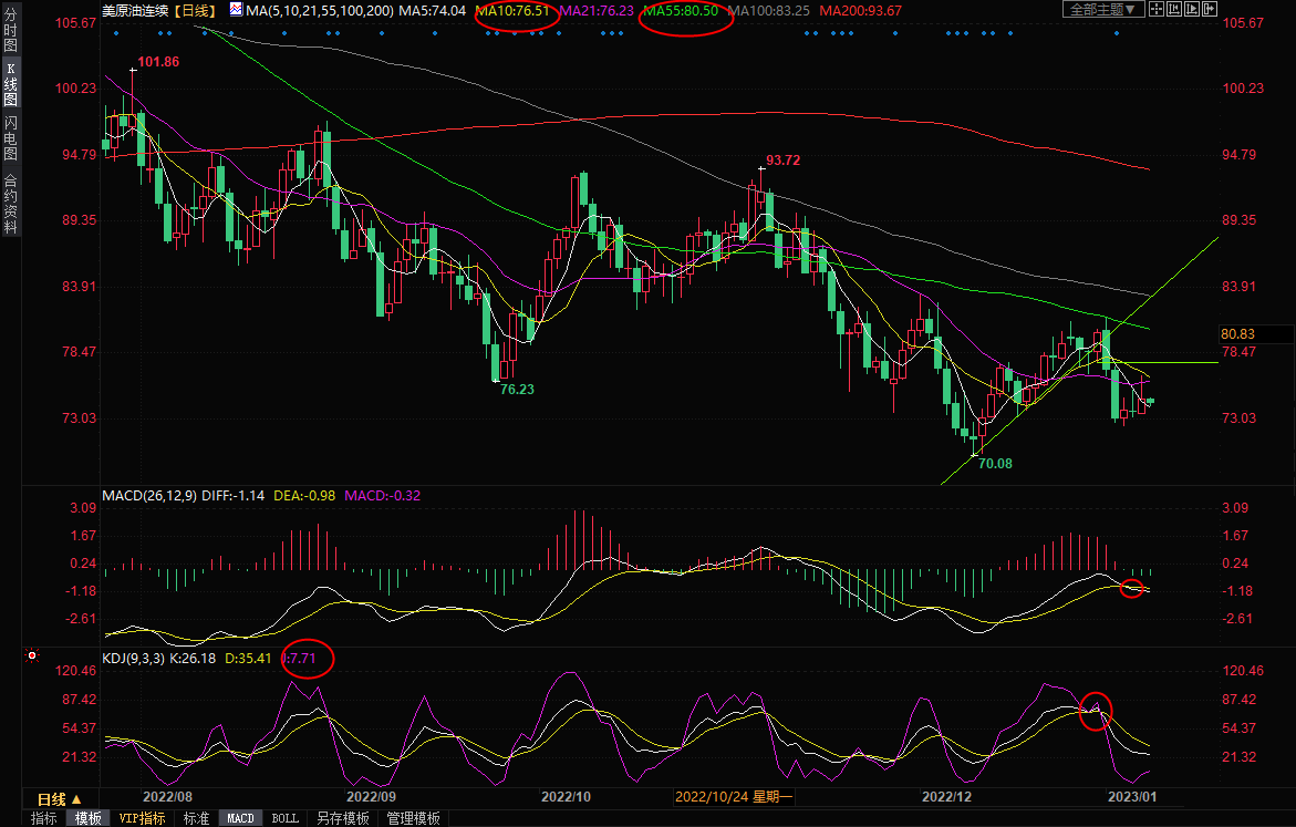 日线级别:震荡;MACD死叉,KDJ四叉,上一交易日油价再次反弹受阻,受到10日均线压制,21日均线也得而复失,顶破10日均线76.51前,后市略微偏向震荡下行,初步支撑在周一低点73.57附近,上周低点支撑在72.44附近,若失守该支撑,则油价可能会进一步试探70整数关口附近支撑,12月9日触及的近一年低点支撑也在该位置附近。如果进一步下破,则增加中线看空信号。