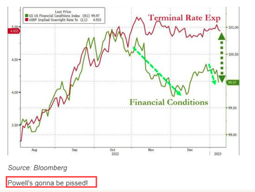 对此,知名财经博客网站Zerohedge就认为,面对着当前再度变得宽松的市场环境,美联储主席鲍威尔今晚可能会“生气”。从近来的走势看,尽管上周的美联储会议纪要特别警告市场,不要“毫无根据地”放松金融状况,但市场金融状况反而出现了进一步的放松。这一差异可能令鲍威尔在今晚继续咬定鹰派不放松……